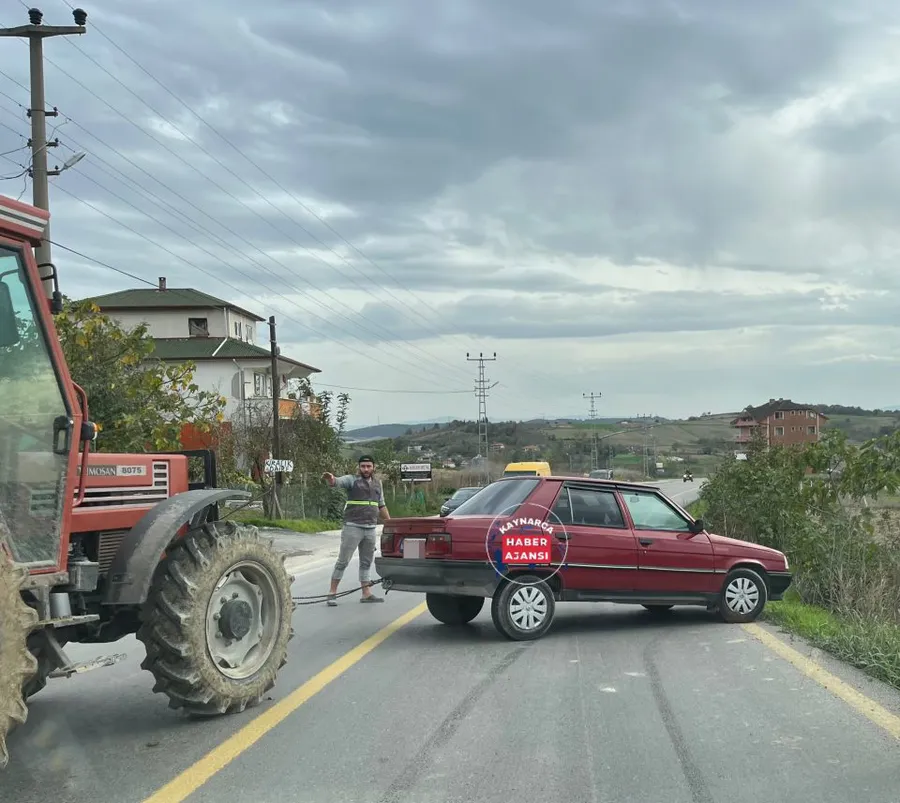 Yoldan geçen trakörün yardımı ile şarampolde bulunan otomobil çekilerek kurtarıldı.Şarampolden kurtarılan araç her hangi bir hasar almadan yoluna devam etti.Geçmiş olsun