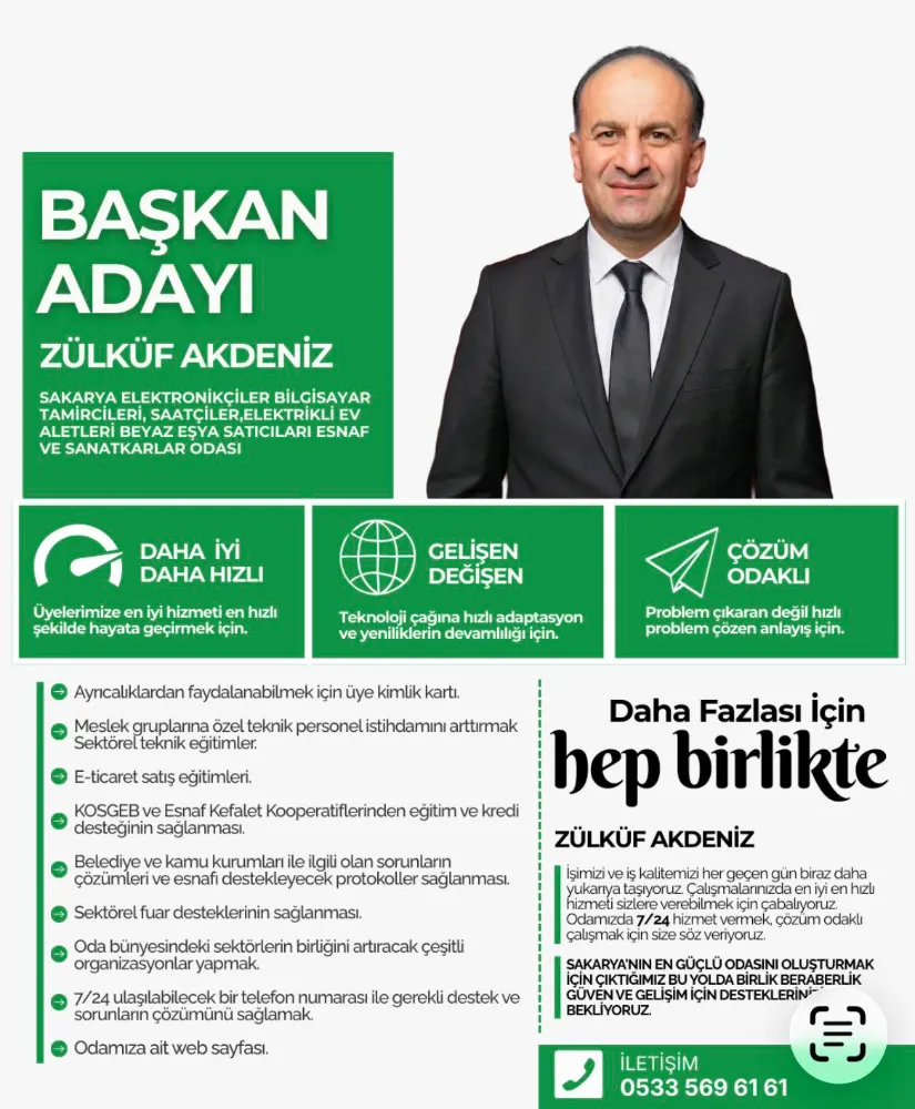Kaynarcalı Hemşehrimiz Adaylığını açıkladı. Zülküf Akdeniz : 8 Şubat 2026 tarihinde yapılacak olan Sakarya Elektronikçiler Bilgisayar Tamircileri Saatçiler Elektrikli Ev Aletleri Beyaz Eşya Satıcısı Esnaf Ve Sanatlarlar odası seçimli genel kurulunda aday olduğumu belirtmek isterim.Yönetim kurulunda bulunan arkadaşlarımızla beraber odamızın ve ilimizin gelişimine destek olmak istiyoruz.dedi. Kendisine başarılar diliyoruz