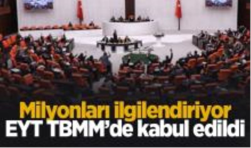 TBMM Genel Kurulunda, EYT ile ilgili düzenlemeleri içeren Sosyal Sigortalar ve Genel Sağlık Sigortası Kanunu ile 375 sayılı Kanun Hükmünde Kararnamede Değişiklik Yapılmasına Dair Kanun Teklifinin tümü üzerindeki görüşmeler tamamlandı.