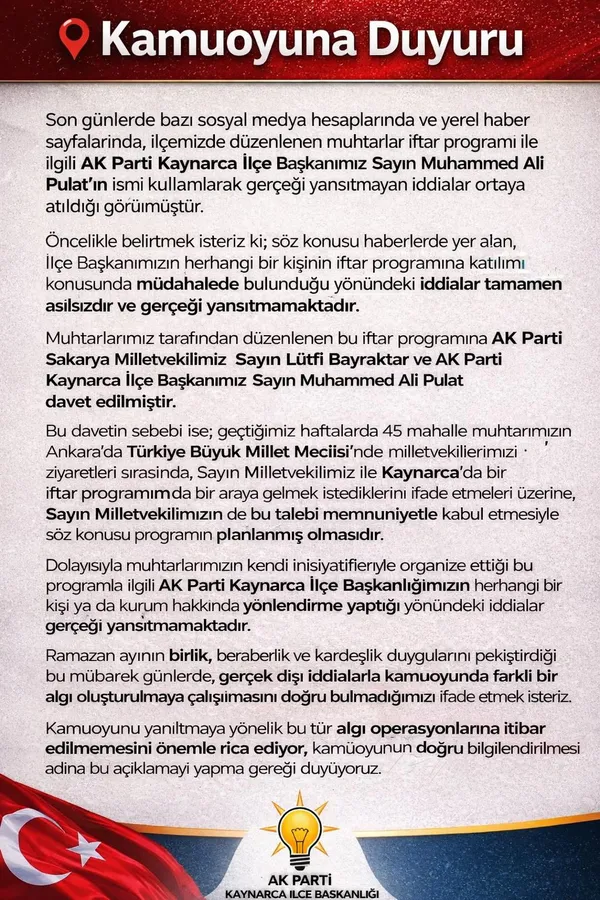 Kaynarca'mızın gelişimi için belediye başkanımız Kadir YAZGAN başta olmak üzere bütün seçilmiş ve atanmış bürokratlarla güçlü iş birliğimizi sürdürmeye devam edeceğiz. Dün akşam yaşanan iftar polemiğinden belediye başkanımız sayın Kadir YAZGAN'ın haberi vardı, iftar programını bizzat ben arayarak bilgi verdim ve davet ettim bunun üzerine kendisi "siz iftarınızı yapın biz hep beraberiz" ifadesini kullandı. Kadir YAZGAN adıyla yapılan mesnetsiz haberlerin tamamından muhtarlar derneği ve ilçede görev yapan muhtarlarımız rahatsız olmuştur. Yaklaşık bir hafta önceden programlanan iftar programının iftar saatine dakikalar kala haber yapılıp sosyal medyada paylaşılması çok manidardır. İftar programımızda da muhtarlarımız ile birlikte sadece milletvekilimiz ve beraberindeki heyet vardı.