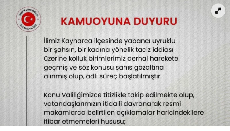 Sakarya Valiliğinden  kaynarcadaki 5-9-2024 gecesi taciz olayı ile ilgili resmi açıklama geldi .